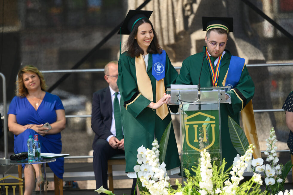 Decan de promoție al specializării Bioinginerie: șef de lucrări Mădălina Poștaru: „În momentul în care ne-am întâlnit prima dată, mi-am imaginat că fiecare dintre voi este o pânză pe care trebuie să pictăm, și eu, și colegii mei, fiecare cu câte o pensulă și o culoare și bineînțeles că scopul nostru era ca, în final, să obținem capodopere. Astăzi, privindu-vă, vă spun sincer, că am reușit. Sunteți absolut fantastici și sper ca în continuare culorile să vi le alegeți voi, astfel încât tabloul pe care îl veți obține ăn final să fie exact în nuanțele pe care le doriți”.