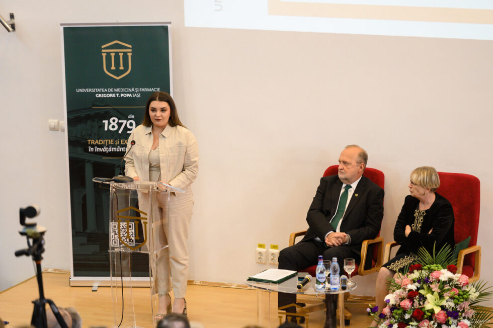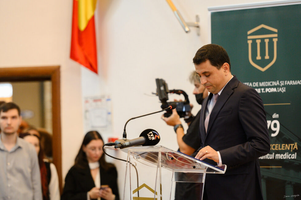 Un moment emoționant al ceremoniei a fost citirea, pentru prima dată, a „Jurământului Studentului la UMF Iași”, un angajament solemn pe care toți studenții îl vor lua, de acum înainte, reflectând valorile de respect, angajament și responsabilitate față de Universitate, colegi și pacienți: