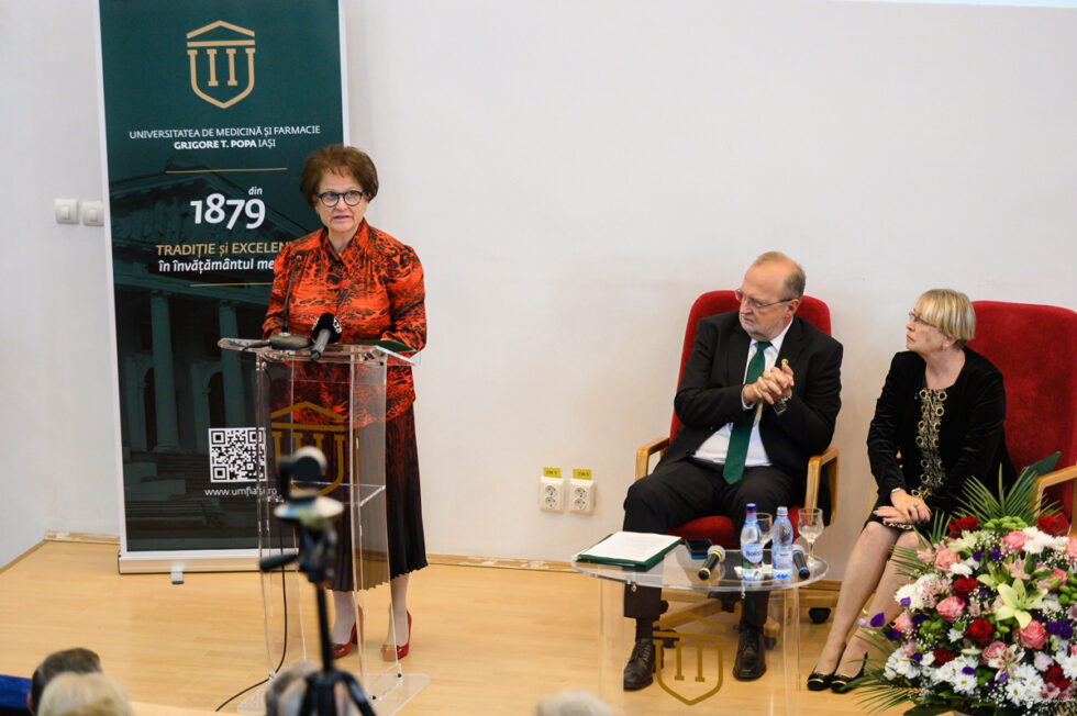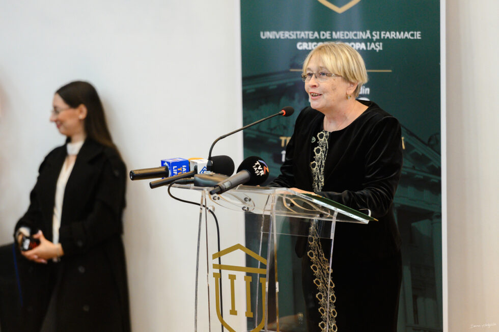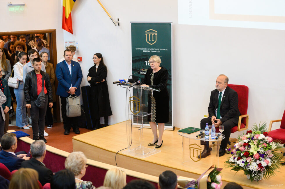 În alocuțiunea sa, prof. univ. dr. Irina-Draga Căruntu, președintele Senatului Universitar al UMF Iași, le-a vorbit studenților despre trăirile profunde simțite la debutul acestui nou an academic, despre emoția „revenirii în spațiul vital în care trăim profesional – în amfiteatre, săli de lucrări practice și saloane de spital”, dar și „pentru reîntâlnirea cu colegii, pentru primul curs cu o nouă generație de studenți, a căror atenție trebuie captată printr-un balans inteligent între principiile pedagogiei clasice și dialogul modern bazat pe instrumente digitale aplicate în educația medicală.”. În același timp, noul an vine și cu provocări, „pentru că avem așteptări mari de la noi înșine, și de la cei din jurul nostru – studenți și cadre didactice, în drumul nostru deschis către dezvoltare, perfecționare și progres.” Provocări care pornesc de la întrebări esențiale pentru dezvoltarea profesională, precum „Ce putem face mai mult pentru educație, cercetare și practică medicală?”, „Ce putem face mai bine?” sau „Cum putem valorifica propriul nostru potențial și resursele existente?”