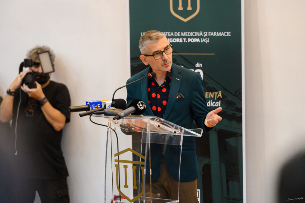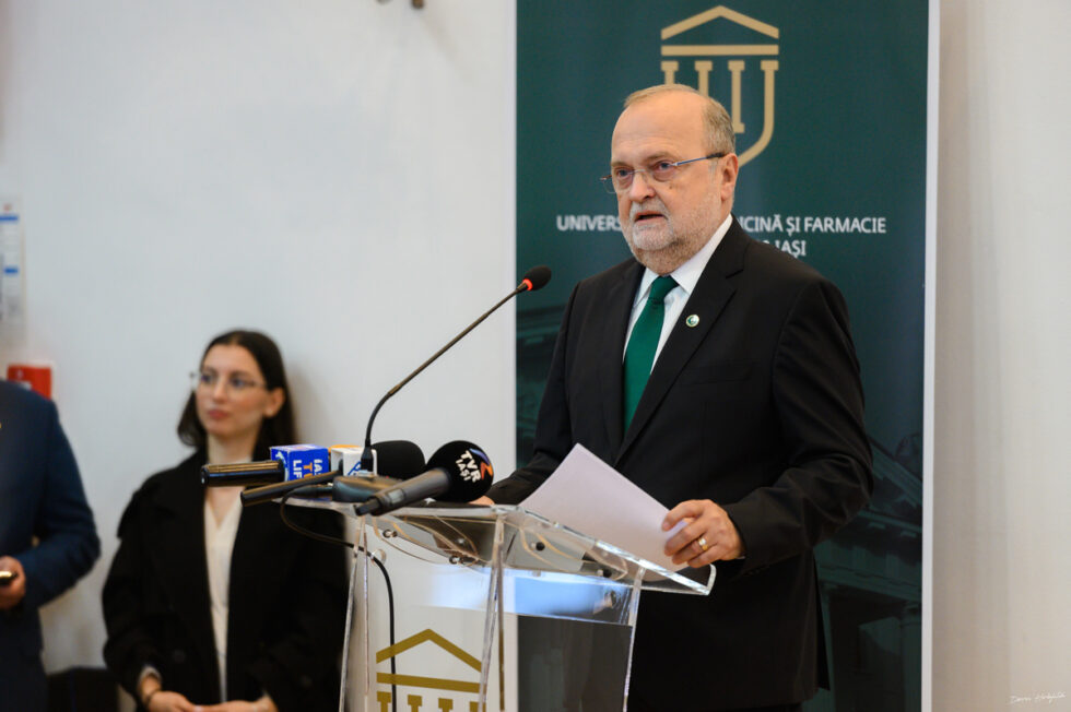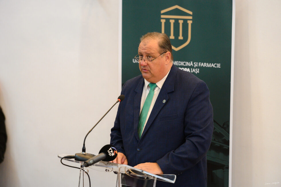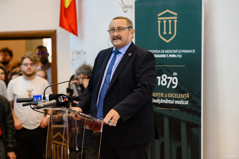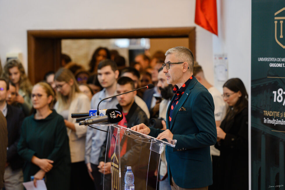 Prof. univ. dr. Viorel Scripcariu, rectorul Universității, și-a început discursul adresându-se studenților din anul I cu o notă de optimism, evidențiind oportunitățile, dar și provocările care îi așteaptă pe cei peste 2100 de noi studenți ce s-au alăturat marii familii UMF Iași: „Începeți astăzi prima etapă a parcursului profesional, studiile de licență. Cu siguranță că sunteți nerăbdători și stresați, în același timp, de începerea cursurilor, dar vă garantez că și noi, dascălii voștri, nu suntem lipsiți de emoții, în ciuda experienței acumulate. Ne asumăm o responsabilitate și un angajament deosebite – azi, mai mult decât oricând, deoarece traversăm o perioadă de transformări semnificative și oportunități fără precedent. Lumea se schimbă rapid, iar o dată cu ea se schimbă și paradigmele învățării. Iar generația voastră, dragi studenți, vine cu așteptări noi și un mod de gândire adaptat unei epoci dominate de inteligența artificială, tehnologiile avansate și accesul nelimitat la informație. Așa cum spunea Alvin Toffler, «analfabetul secolului XXI nu va fi cel care nu știe să citească și să scrie, ci cel care nu știe să învețe, să se dezvețe și să reînvețe»”.