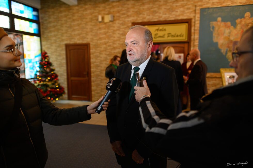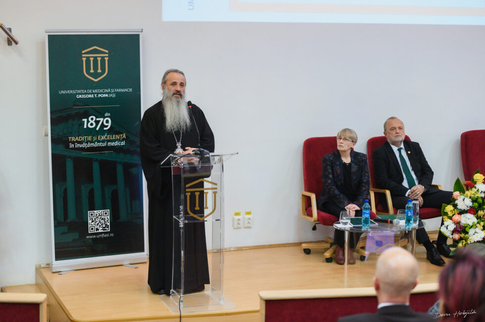 La manifestare a participat și Înaltpreasfințitul PărinteTeofan, mitropolit al Moldovei și Bucovinei, care a transmis Universității un triplu gând: de mulțumire, de binecuvântare și de urare. „Adresez un gând de binecuvântare legat de ceea ce mi se întâmplă și mie și multora preoți când ne întâlnim cu dumneavoastră la Sfânta Parascheva sau în alte situații și vedem un venerabil profesor, cu realizări în multe domenii, care, cu duh smerit, spune : «Roagă-te și pentru mine părinte, roagă-te și pentru mine că am un caz special». Adică oameni care se încred în știința lor medicală, dar au capacitatea să privească și dincolo. Și lucrul acesta arată și o altă dimensiune a lucrării dumneavoastră, decât cea pur medicală. Și eu răspund adesea, când apar pacienți la Mitropolie sau în alte locuri, și se plâng și îmi cer sfatul: «Gândul la Dumnezeu și medic bun!»”.