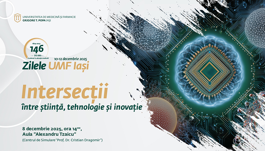 Luni, 8 decembrie, între orele 14.00 și 17.00, Aula „Alexandru Tzaicu” (Centrul de simulare „Prof. Univ. Dr. Cristian Dragomir”) va găzdui seria de prelegeri „Intersecții între știință, tehnologie și inovație”, organizată de Facultatea de Bioinginerie Medicală a Universității de Medicină și Farmacie „Grigore T. Popa” din Iași, în cadrul Zilelor UMF Iași.