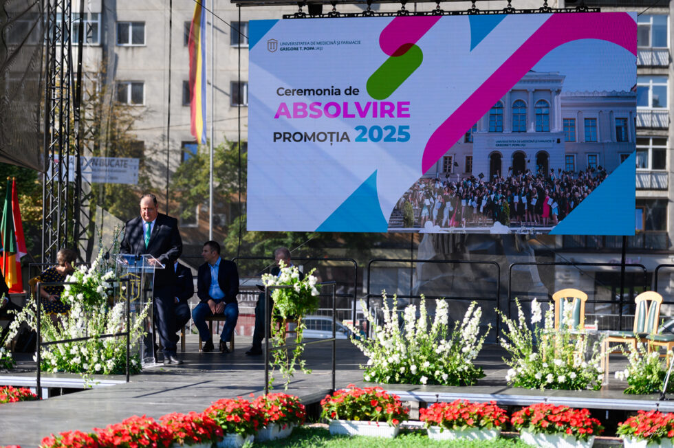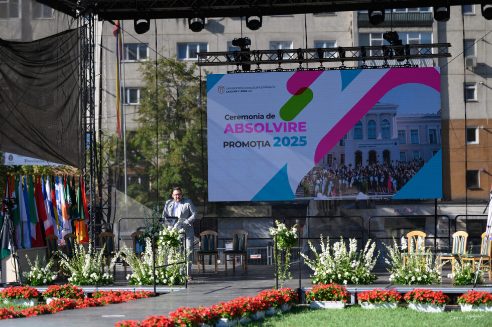 În salutul său adresat promoției 2025, rectorul UMF Iași, prof. univ. dr. Viorel Scripcariu, a vorbit despre complexitatea parcursului studenților și despre misiunea umană a profesiei medicale: „Este o onoare și o bucurie pentru mine să mă aflu astăzi aici, în această zi specială care marchează finalul unei etape semnificative și începutul unei noi călătorii profesionale și umane pentru tinerii absolvenți ai Universității noastre. Este o zi în care visurile devin realitate, iar eforturile voastre, ale absolvenților, se văd răsplătite.”