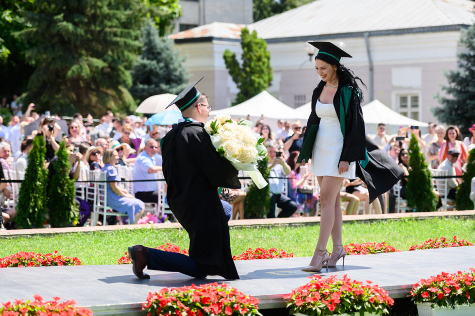 Unul dintre cele mai personale și emoționante momente ale zilei a avut loc în timpul cursului festiv al Facultății de Medicină Dentară, când un absolvent și-a surprins partenera – colegă de facultate – cu o cerere în căsătorie inedită pe scenă, în fața întregii promoții. „Scenariul” a fost pregătit în complicitate cu organizatorii și prietenii apropiați, iar reacția emoționată a viitoarei mirese, urmată de aplauzele și entuziasmul colegilor, s-a imortalizat într-o amintire de suflet pentru viitoarea familie de medici dentiști.