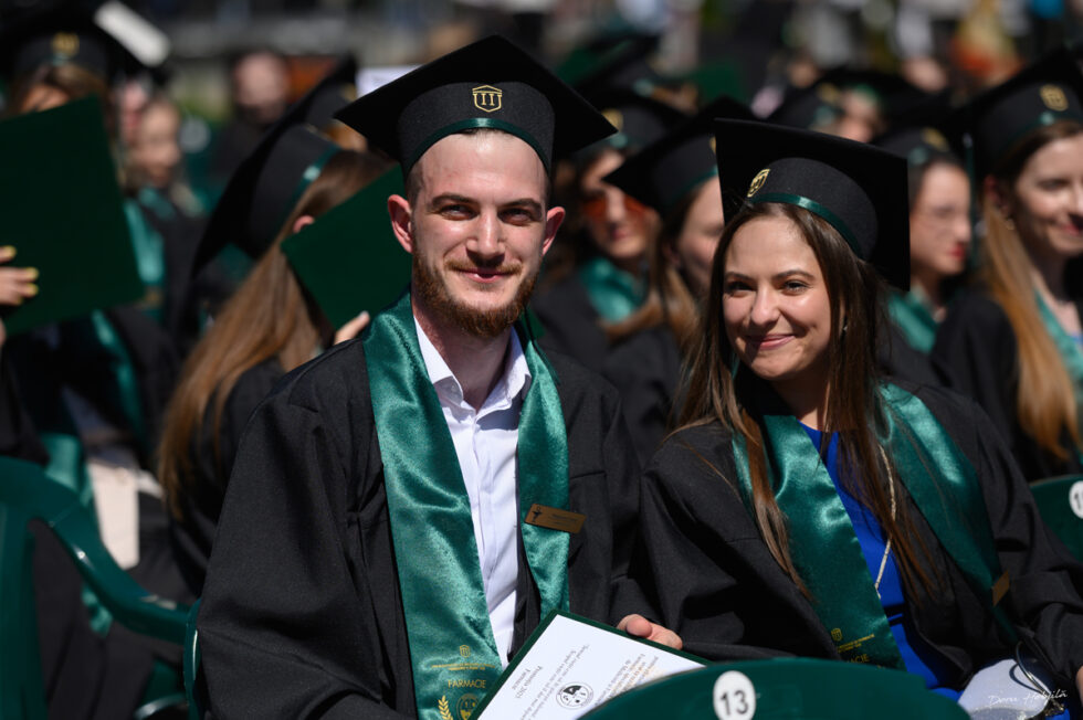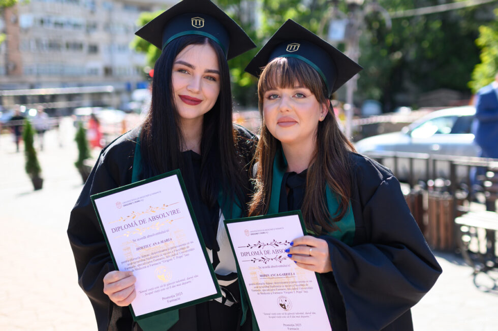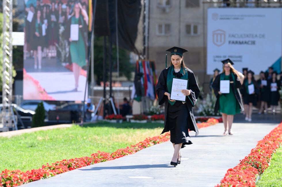 Atmosfera de sărbătoare a continuat cu ceremonia dedicată absolvenților Facultății de Farmacie. Cei 126 de absolvenți ai programului de studii Farmacie și cei 42 de absolvenți ai specializării Cosmetică medicală și tehnologia produsului cosmetic au urcat pe scenă în aplauzele colegilor, ale profesorilor și ale familiilor.