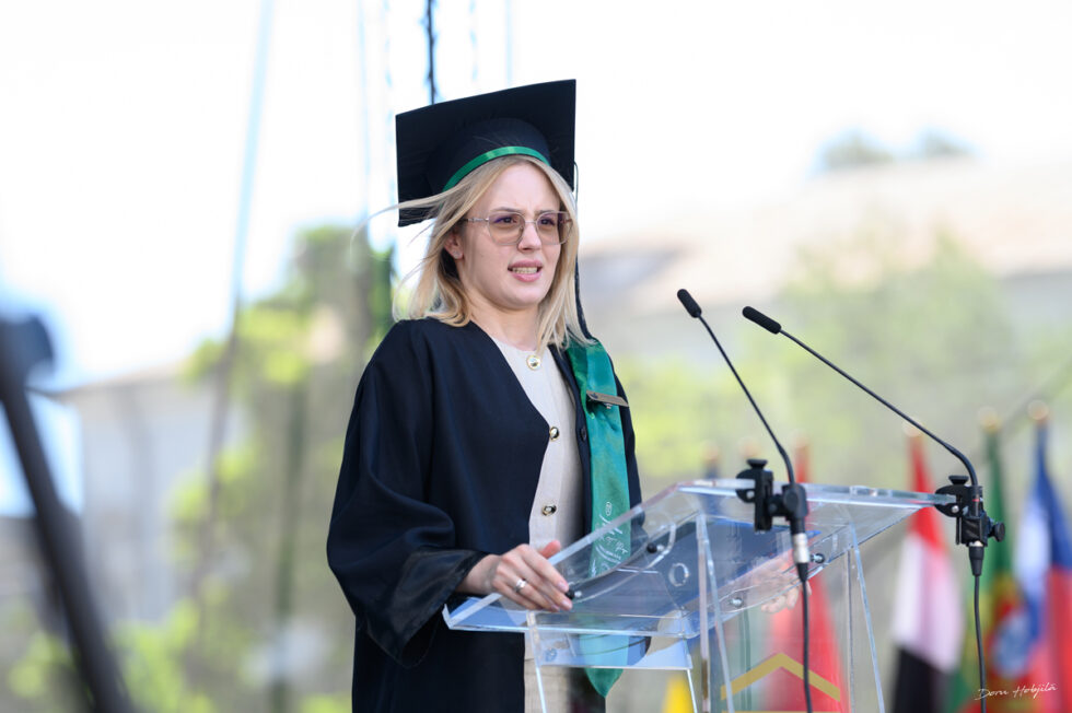 Un mesaj plin de emoție și sinceritate a fost transmis de Alexandra Bujor, absolventă a Facultății de Medicină și scriitoare, care nu a urcat pe scenă, dar a dorit să împărtășească în mod personal gândurile sale: „Mă îndrept cu mulțumiri și recunoștință față de instituția care m-a format în acești șase ani și față de profesorii care mi-au devenit inspirație. Facultatea de medicină nu este nicidecum ușoară, dar provocările au darul de a ne șlefui spre cea mai bună variantă a noastră. Și ce ar fi viața fără provocări? Acest drum nu este numai despre a învăța despre boli și tratamentele lor, ci, la un nivel mai profund, mi-a arătat cum să cunosc omul din fața mea, poate în momentele sale cele mai dificile; cu răbdare și blândețe, mascate de siguranța pe care o inspiră cuvintele medicului. Anamneza este un test despre cum se pun întrebările deștept, iar poate cea mai importantă lecție este că nu avem de a face niciodată cu un simplu „caz”, ci cu o persoană, de fiecare dată, unică. M-a încurajat să fiu curioasă, să citesc mai mult, m-a învățat că literatura este prietenă cu medicul, și de folos, să fiu deschisă și să învăț de la toată lumea, să îndrăznesc să privesc mai departe decât poate am curajul. Am studiat un an în Germania, un semestru minunat în China, practicile de vară am avut șansa să le fac în țări precum Franța, Slovenia sau Malta. Toate acestea sunt experiențe memorabile care mi-au schimbat viața și pe care le datorez deschiderii pe care Universitatea aleasă cu toată inima acum 6 ani o are din plin.