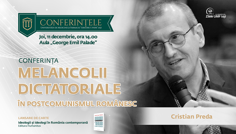 Joi, 11 decembrie, de la ora 14:00, Aula „George Emil Palade” găzduiește, în cadrul Zilelor UMF Iași, conferința Melancolii dictatoriale în postcomunismul românesc, susținută de prof. univ. dr. Cristian Preda. Evenimentul va fi urmat de lansarea volumului Ideologii şi ideologi în România contemporană (Editura Humanitas, 2025), o carte care radiografiază decenii de viață politică românească.
