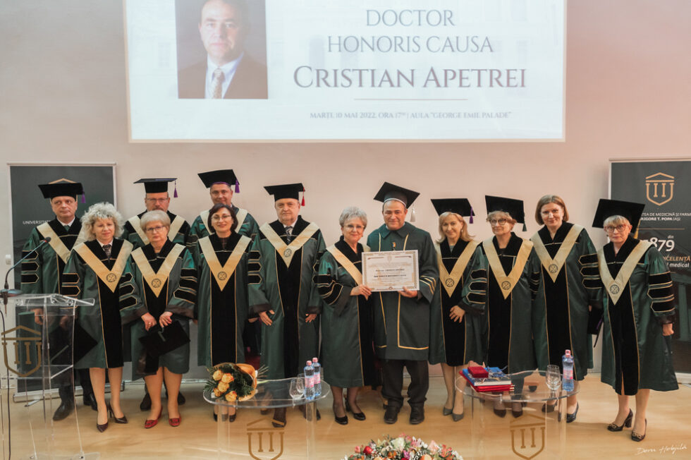 În spiritul acestei tradiții, oferim astăzi expresia cea mai înaltă a recunoasterii noastre – Titlul de Doctor Honoris Causa – Domnului Profesor Cristian Apetrei, de la Division of Infectious Diseases, Department of Medicine, University of Pittsburgh, SUA.