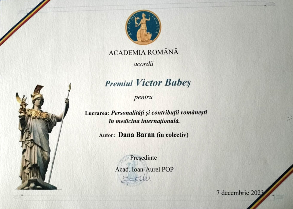 Academia Română a acordat premiul „Victor Babeș” doamnei prof.univ. dr. Dana Baran și regretatului prof univ. dr. Radu Iftimovici pentru lucrarea „Personalităţi şi contribuţii româneşti în medicina internaţională”, apărută în 2021 la Editura Academiei Române.
