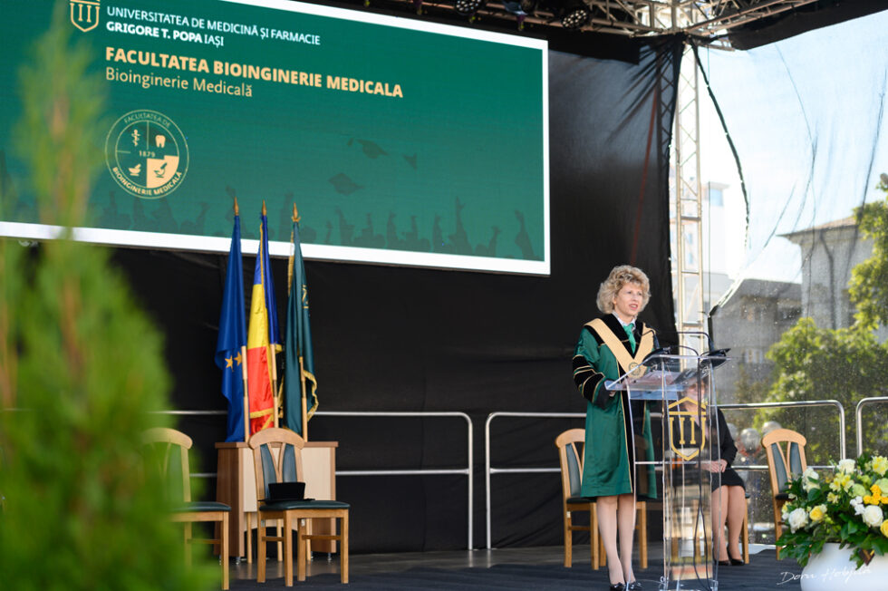 Ultimii strigați, dar nu cei din urmă, au fost absolvenții Facultății de Bioinginerie Medicală: 66 de la specializarea Bioinginerie și 107 de la Balneofiziokinetoterapie și Recuperare. „Ați ajuns aici pentru că ați muncit, ați învățat, ați fost ghidați. Prin munca, gândirea, prin ideile pe care le-am pus în comun și am dus lucrurile mai departe. Vă încurajez să gândiți liber, să vă antrenați mental să ajungeți la performanțele pe care doar le-ați visat atunci când ați dat admitere la facultate”, le-a transmis prof. univ. dr. Anca Galaction, decanul Facultății de Bioinginerie Medicală.