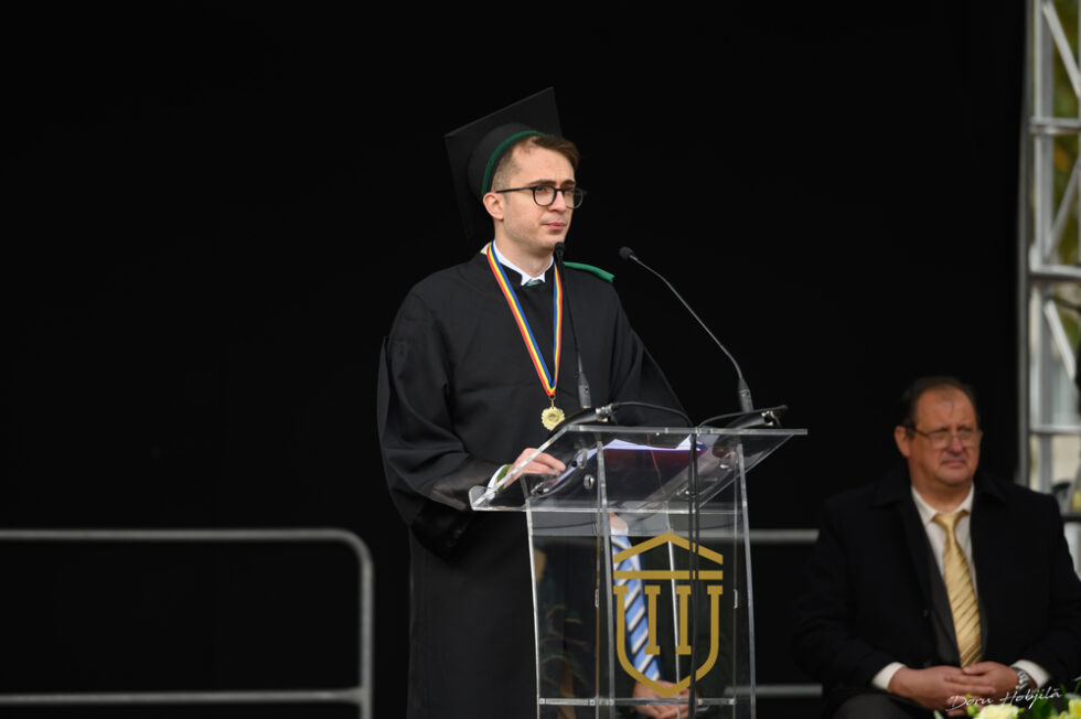 Ceremonia de absolvire a început cu tradiționalul ceremonial al drapelurilor reprezengtate de studenții care urmează cursurile UMF Iași. A urmat salutul rectorului UMF Iași, prof. univ. dr. Viorel Scripcariu, care a subliniat că drumul parcurs până în ziua absolvirii nu a fost unul uşor, mai ales în ultimii doi ani: „Contextul pandemic ne-a obligat să ne adaptăm şi a dictat măsuri pe care nu le-am dorit, dar care au fost imperios necesare. Eram obișnuiți să urmăm un singur fir roşu în activitatea noastră, şi anume performanţa, până la atingerea excelenţei în actul didactic. Pandemia ne-a forţat însă să urmăm şi un al doilea fir roşu: siguranţa dumneavoastră, a studenţilor, siguranţa pacienţilor cu care aţi interacţionat, siguranţa noastră, a tuturor. A trebuit să luăm decizii dificile, chiar neplăcute în unele cazuri. În numele Universităţii, vă asigur că au fost decizii la care am cumpănit mult, căutând echilibrul ideal între siguranţă şi performanţa actului educaţional. Iar rezultatele acestor căutări s-au văzut inclusiv în investiţiile pe care le-a prioritizat Universitatea în ultimii ani. A trebuit să luăm decizii dificile, chiar neplăcute în unele cazuri. În numele Universităţii, vă asigur că au fost decizii la care am cumpănit mult, căutând echilibrul ideal între siguranţă şi performanţa actului educaţional. Iar rezultatele acestor căutări s-au văzut inclusiv în investiţiile pe care le-a prioritizat Universitatea în ultimii ani. Centrul de Simulare «Prof. Univ. Dr. Cristian Dragomir» este un exemplu perfect în acest sens. Am prioritizat şi finalizat acest proiect în timp record, pentru a putea compensa restrângerea activităţii practice în spitalele clinice. Studenţii noştri au avut astfel ocazia să exerseze procedurile medicale pe simulatoarele performante din Centru, într-un mediu controlat şi eliminând astfel riscurile epidemiologice la care s-ar fi supus atât ei, cât şi pacienţii din spitalele universitare. Corpul de clădire «Nicole Leon», de departe cea mai mare investiţie a Universităţii de după 1989, este un alt exemplu elocvent. Am folosit noile spaţii de învăţământ disponibile pentru a dispersa pe cât de mult posibil desfăşurarea activitaţilor didactice, evitând astfel aglomerările şi riscurile aferente”. Rectorul Universității a mai ținut, în alocuțiunea sa, să le mulțumească absolvenților: „Vă mulţumesc pentru că aţi înţeles interesul nostru comun de a continua procesul de învăţare în condiţii optime de performanţă, dar şi de siguranţă. Vă mulţumesc pentru adaptabilitatea de care aţi dat dovadă atunci când am fost nevoiţi să mutăm întregul proces didactic în mediul online – şiştiu că nu v-a fost uşor. Vă mulţumesc pentru mobilizarea dvs. în efortul Universităţii de a contribui la lupta întregii societăţi împotriva pandemiei – şi mă refer aici la implicarea dumneavoastră activă în evenimente extra curriculare, precum Maratonul de Vaccinare. Pe scurt, vă mulţumesc pentru că v-am simţit permanent alături, iar paşii pe care i-am facut, dificili uneori, i-am făcut împreună.”