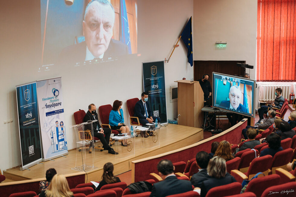 În alocuțiunea sa, amfitrionul evenimentului, prof. univ. dr. Viorel Scripcariu, rectorul UMF Iași, a punctat implicarea totală a Universității de Medicină și Farmacie „Grigore T. Popa” din Iași în gestionarea crizei sanitare, dând ca exemplu deschiderea, încă de anul trecut, a laboratorului de testare Real Time PCR în cadrul CEMEX, dar și a centrului de vaccinare din cadrul UMF Iași, în urmă cu două luni. Domnia sa a făcut și un anunț în premieră – realizarea unui maraton al vaccinării pentru ieșeni, după modelul UMF Timișoara: „Și UMF Iași va desfășura acest tip de acțiune, în perioada 14-16 mai, maraton care se va adresa tutror ieșenilor. Nu ne propunem să atingem un target, dar dorim să venim încă o dată în sprijinul comunității locale”. Potrivit rectorului UMF Iași, atât UMF Cluj, cât și UMF Tîrgu Mureș și-au manifestat dorința de a organiza un astfel de maraton la nivel local.