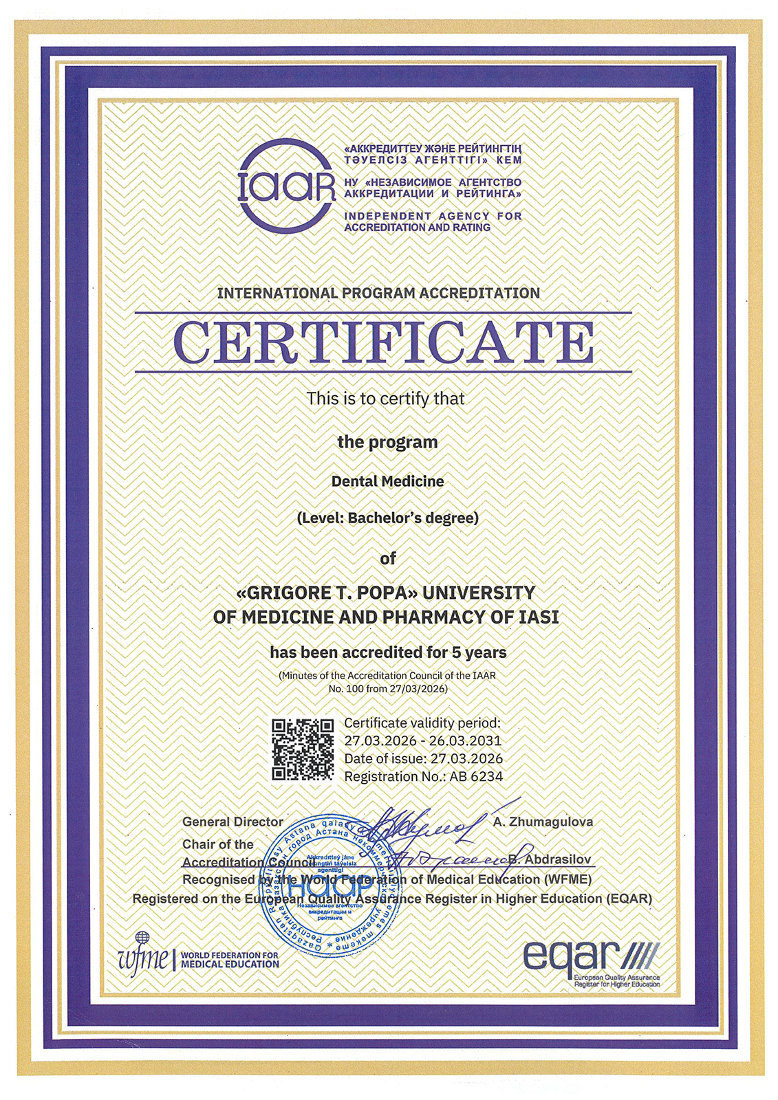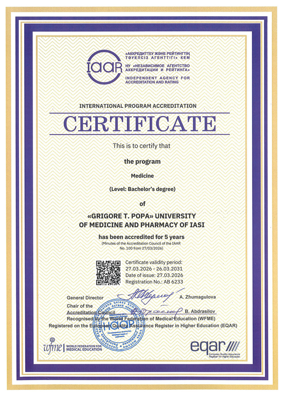 Acreditarea este valabilă pentru o perioadă de cinci ani, începând cu 27 martie 2026 și până la 26 martie 2031. Programele sunt recunoscute de WFME și sunt înregistrate în European Quality Assurance Register in Higher Education (EQAR), ceea ce confirmă conformitatea acestora cu standardele internaționale de calitate în educația medicală.